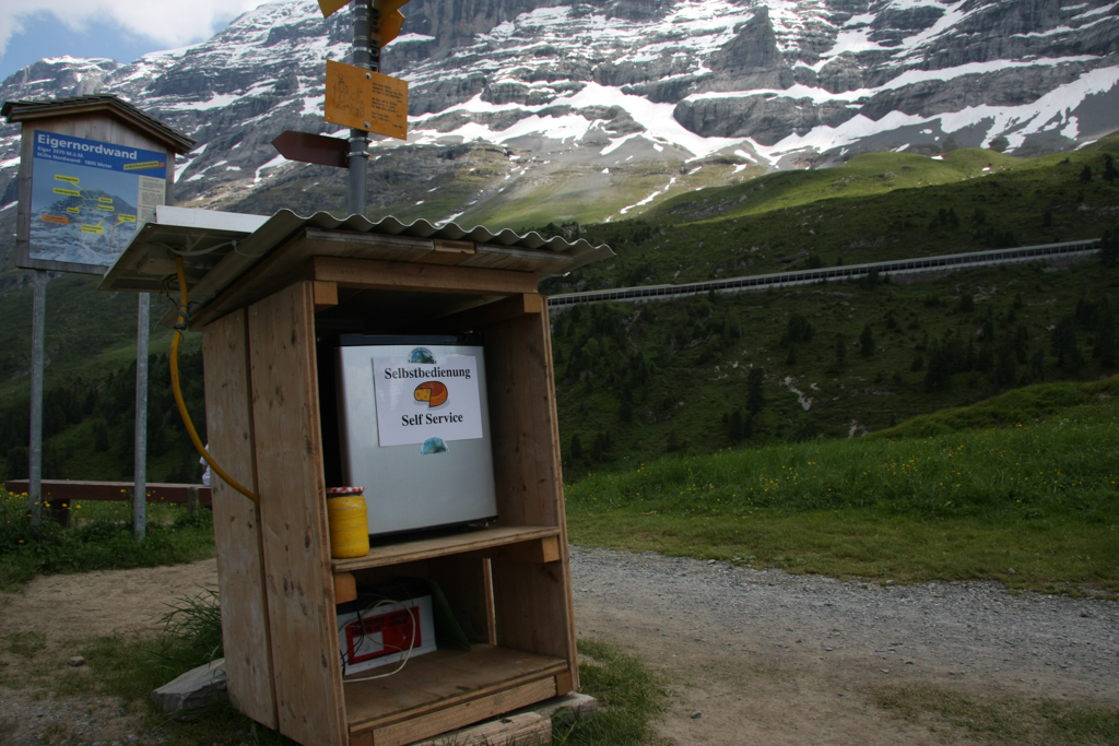 Und mit den Leckereien meine ich nicht nur frische Wiesenkräuter. Die Schweizer Bergbauern sind ja nicht dumm und wissen dass man die Touristen (wahrscheinlich insbesondere den Japanern) auch den einheimischen Alpkäse gut verkaufen kann. den gibt es dann am Wegesrand zu kaufen. Natürlich muss er bei diesen sommerlichen Temperaturen von über 30 Grad gut gekühlt werden. Schweizer Bauer nicht dumm stellt einen kleinen Kühlschrank hin der eigentlich an eine Autobatterie gehört und zur Versorgung ein paar Solarzellen aufs Dach. Nur für die Kasse gibt es noch keine ausgefuchste Lösung. Da steht einfach ein Marmeladeglas mit richtig viel Geld drin. Ich hab aber nix rausgenommen.