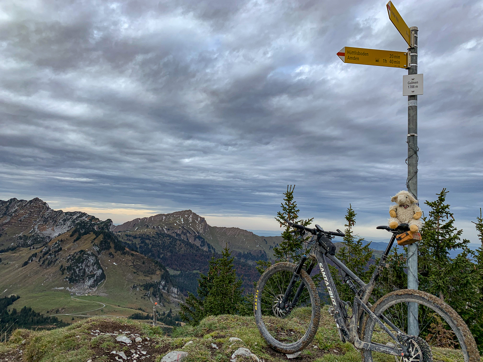 Auf der Abfahrt von Unterchäseren nach Amden probiere ich den Wanderweg aus. Ist zwar nicht lang, aber wirklich schön zu fahren bis auf die Kehren. Die sind mir etwas zu eng und das mit dem Hinterrad versetzen kann ich irgendwie nicht. In Amden geht es zügig auf Asphalt bis Vorderhöhi und von dort steil weiter auf den Gulmen. Kenne ich normalerweise nur als Skitour und die ist in diesem Bereich auch nicht gerade flach. Sobald es ein bisschen nordseitig wird ist es doch eher feucht und schlamming und ich muss einige Strecken schieben, hält sich aber noch in Grenzen. Am Gipfel ist es aber nicht wirklich gemütlich, der Föhn blässt doch ganz gut.