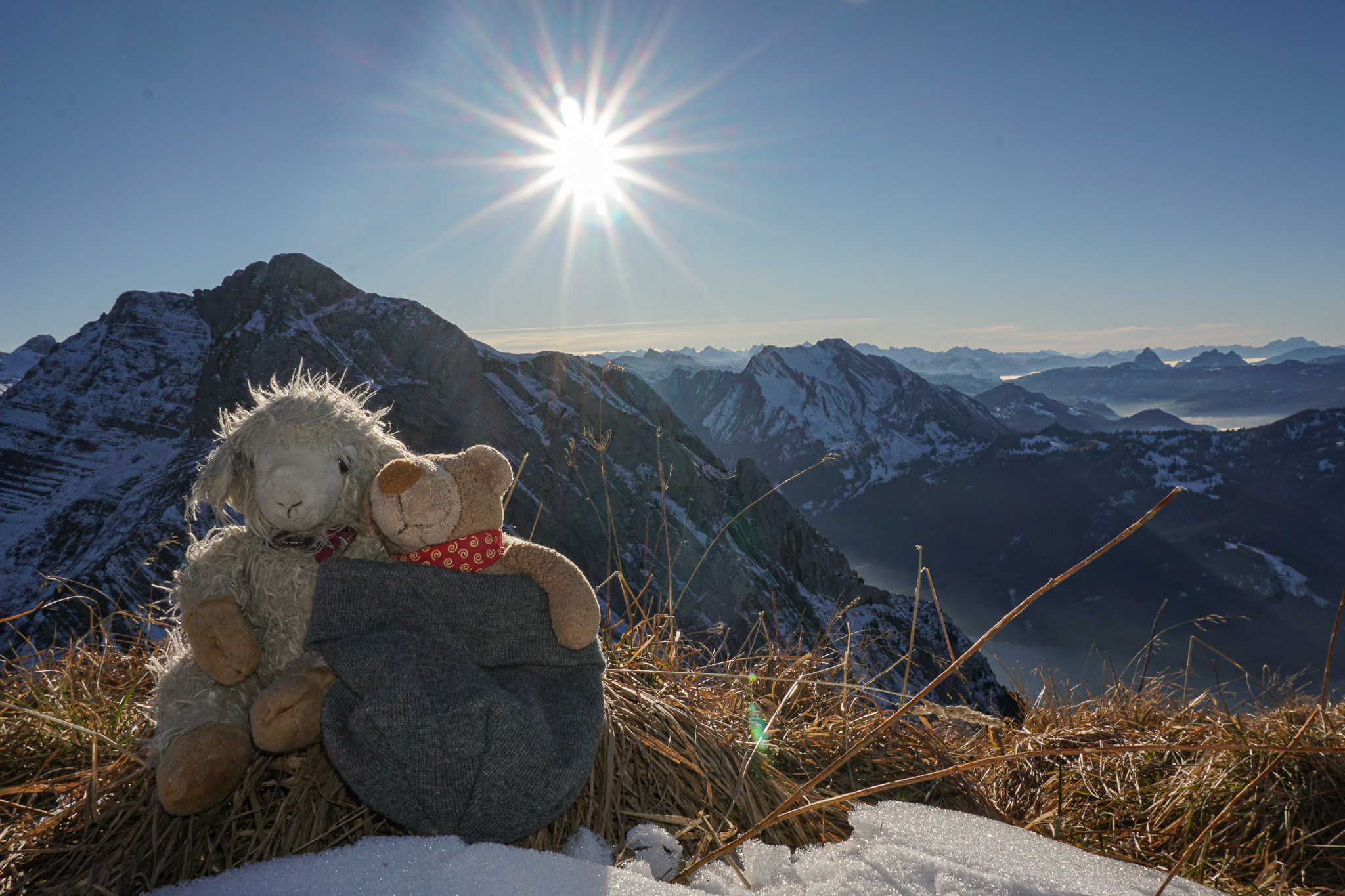 Oben am Gipfel sind wir mal wieder die letzten und haben den ganzen kleinen Gipfel für uns. Ganz gemütlich die Sonne und Aussicht geniessen, auch wenn ein kalter Wind den Aufenthalt etwas ungemütlich macht. Vielleicht war Urs seine Idee den Schlafsack mitzunehmen doch nicht so blöd. Na ja, muss ich eben mein Fell aktivieren. Auch die Zürcher bekommen unser Mitleid - alles unter der Hochnebeldecke, noch nicht mal der Zürcher Hausberg, der Uetliberg schaut raus.