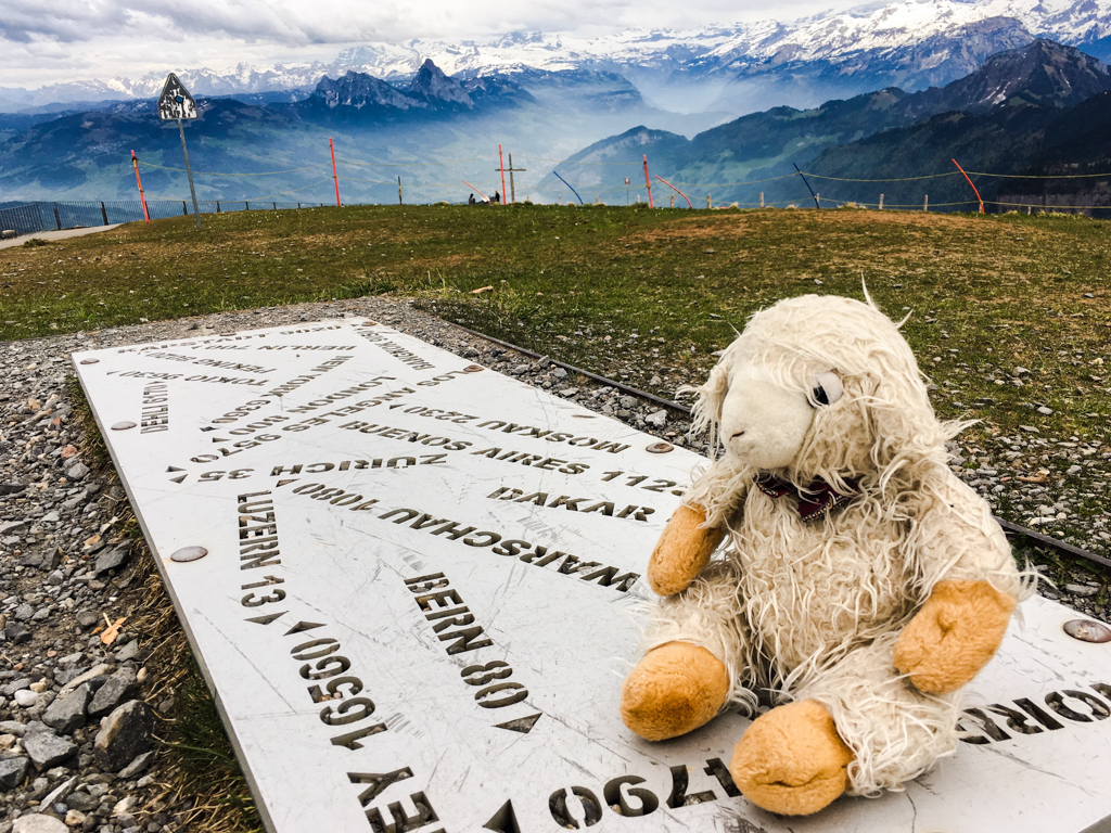 Kurz danach stehe ich schon an der Endstation der Rigi Bahn und mische mich unter die Japaner und Chinesen um die letzten Meter zum Gipfel zu erklimmen. Erklimmen ist vielleicht etwas übertrieben. Der Weg ist wahrscheinlich kinderwagentauglich. Oben dann das obligatorische Gipfelphoto. Die Beschriftung Zürich 35km auf dem Schild täuscht übrigens. Nach Hause bin ich über 56km gefahren. Zwischendrin nochmal ein kurzer Blick zurück auf mein heutiges Ziel.