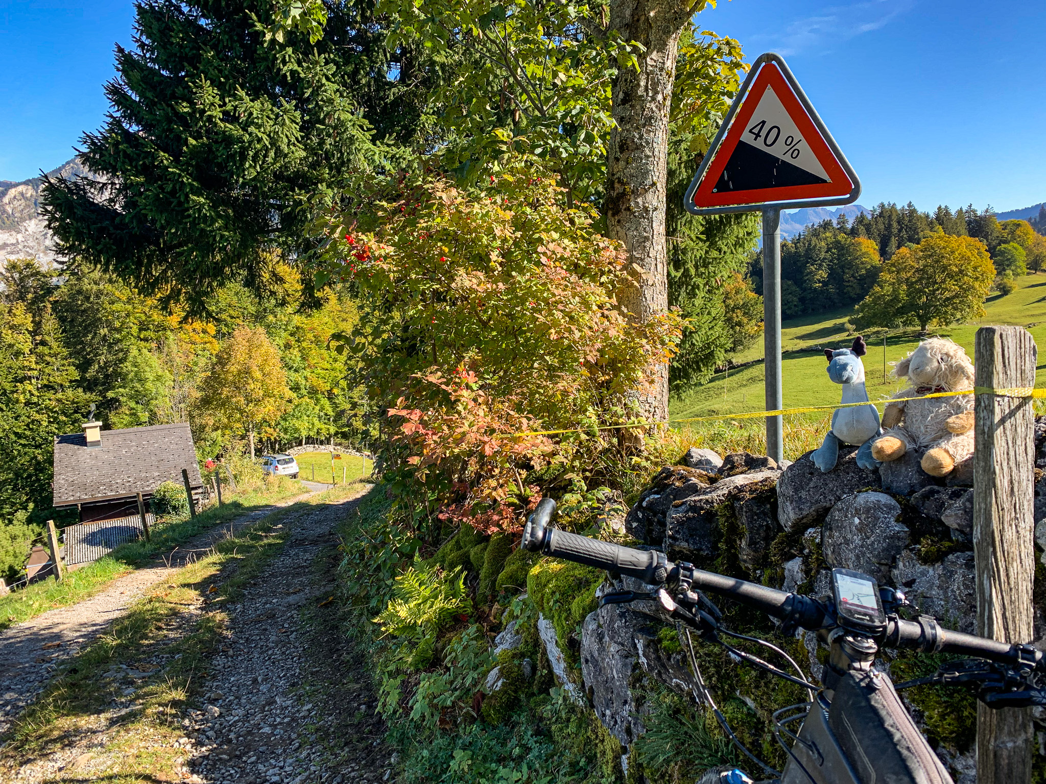 Bis Mühlehorn war die Welt noch in Ordnung und auch noch am Katzenboden mit seiner schönen Herbststimmung. Bald ging es aber überraschend steil zur Sache und bei den 40% Steigung bin ich ganz schön ins Schwitzen gekommen. Wer baut denn bitte so abartig steile Strassen? Die anschliessende Pause am Talalpsee kam da wie gerufen. Während Torri seine Runden geschwommen ist und Fussgänger erschreckt hat, habe ich mein schweissnasses Fell in der Sonne getrocknet.