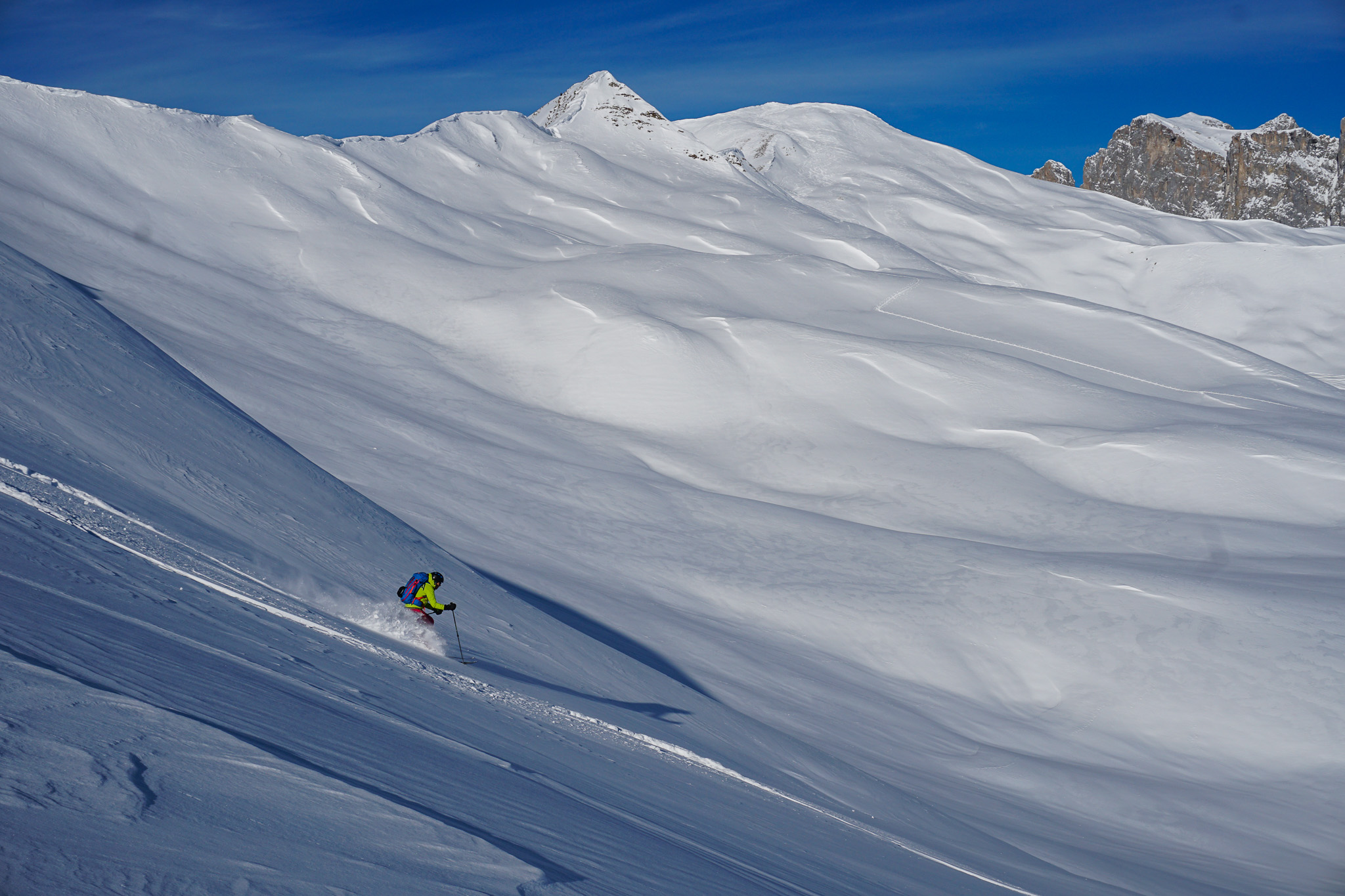 Kurz danach wurde es klar und wir mussten drei grössere Gruppen überholen. Schliesslich wollten wir ja den Pulverschnee auf der Abfahrt für uns haben. Die Gruppen waren aber so langsam, dass sie noch weit vom Gipfel entfernt waren als wir uns schon langsam an die Abfahrt gemacht habe. Zunächst noch kurz entlang der Aufstiegsspur, dann aber bald in den östlichen Gipfelhang abbiegend den Pulver geniessen. Reto hatte uns da nicht zu viel versprochen.