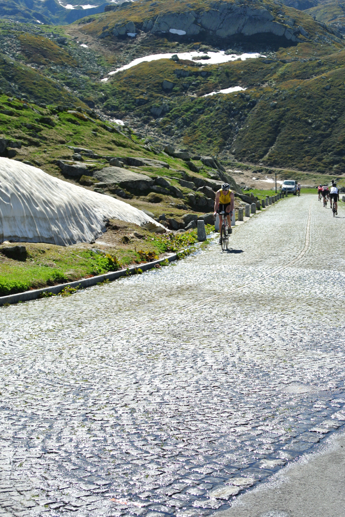 Aber auch so komme ich bis zum Gotthardpass. Mittlerweile hat es schon deutlich weniger Schnee als vor drei Wochen als ich zur Besichtigung hier war. Die Kopfsteinpflasterstrasse ist allerdings immer noch nicht besser geworden. Oben noch mal alle Flaschen vollgemacht - wer weiss wann man seine Supporter wiedersieht. Ausserdem ist auf der Abfahrt Gewicht durch nichts zu ersetzen. Mit teilweise fast 100km/h geht es bergab Richtung Hospental und dann flach nach Realp. Vorschlag im Swissman Roadbook ist übrigens sich kurz hinter Hospental mit seinem Supporter zu treffen. Selbst ohne volle Radflaschen fahre ich nicht so langsam, dass das irgendwie machbar ist. Bei dem schönen Wetter brauche ich sowieso kein Zweitfell für die Abfahrt und der nächste Treffpunkt ist oben am Furkapass.
