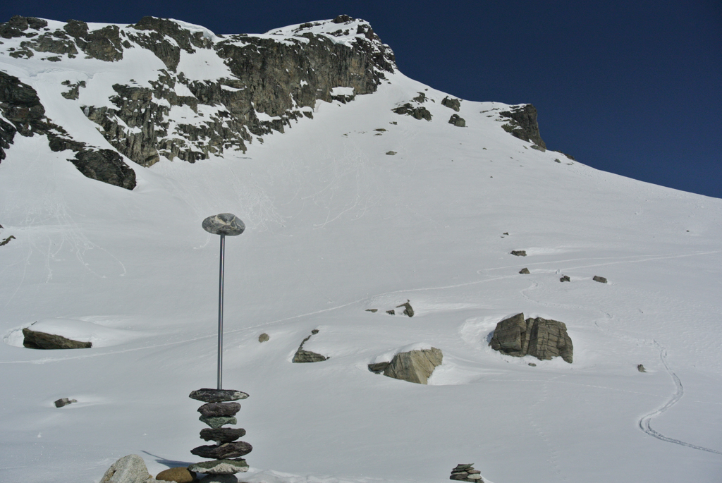 Los ging es von Elm bei schönstem Wetter. Nix Hochnebel. Das versprach eine schöne Frühlingsskitour zu werden. Nachdem wir von der Autobahn Richtung Chli Chärpf abgebogen sind kam auch die Kultur nicht zu kurz. Kunst am Berg damit Grisu auch noch ein bisschen was anderes lernt als Skitouren gehen.