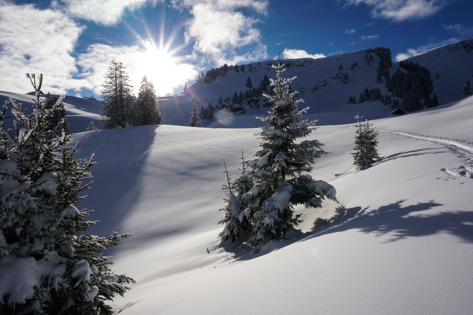Das akustische Erlebnis war allerdings gewöhnungsbedürftig. Es hat die ganze Zeit geklirrt, so als ob man einen riesigen Altglasberg runterfährt. Und ständig überholen einen die kleinen Eisschollen rechts und links. Dem Winterwanderweg folgt man nach Vorder Höhi und dann weiter zum Häderenberg. Von dort kann man wunderbar nach Stein runterfahren, natürlich wieder mit akustischer Untermalung.
