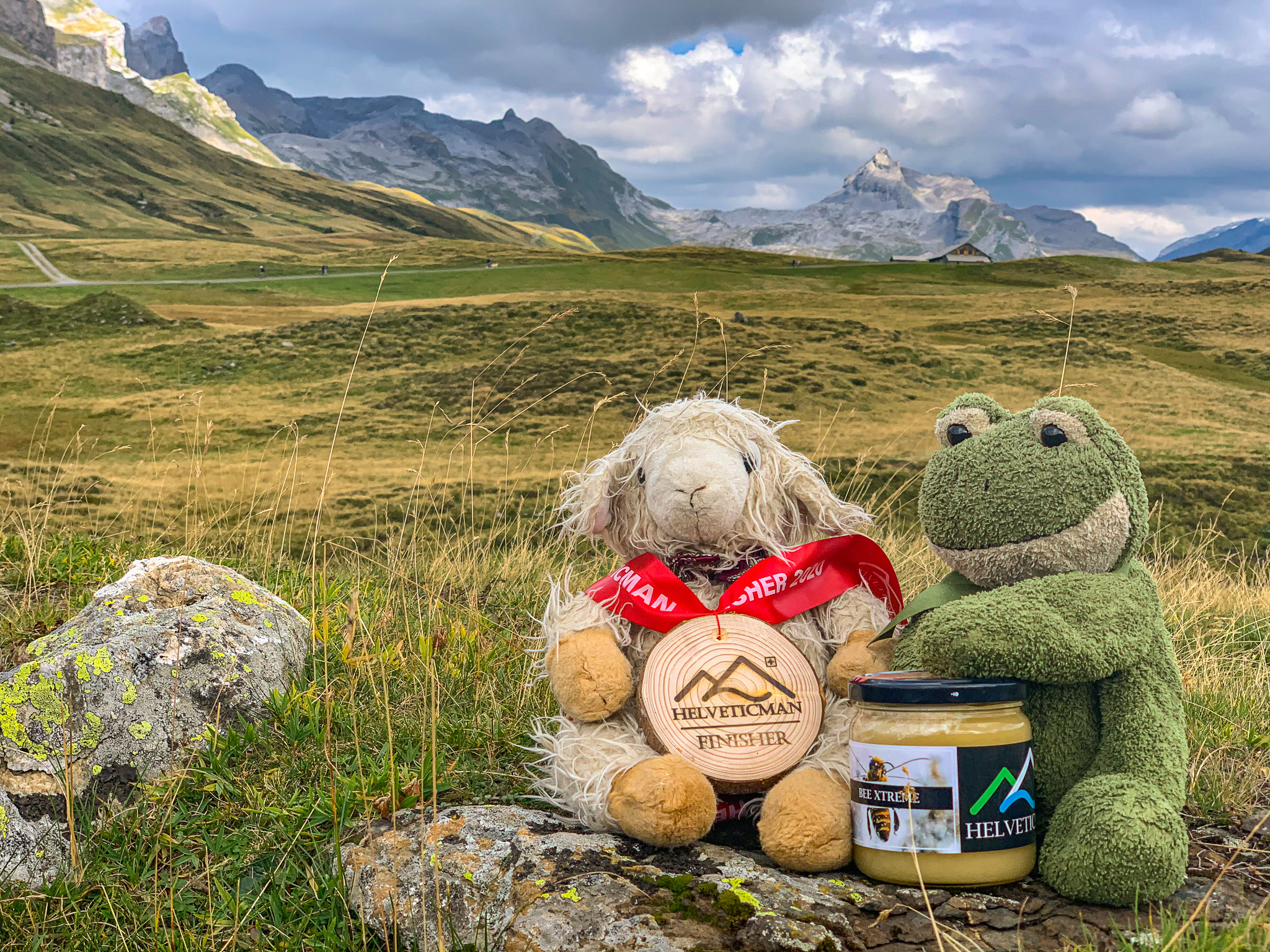 Oben am Melchsee bin ich schon etwas erschöpft als in die Laufschuhe gewechselt wird. Eine Runde um den Melchsee und eine Runde um den Tannensee, aber nicht dass sich das jemand als flache Runde um einen See vorstellt. Auch die Laufstrecke hat 800Hm auf den 21km - da brauche ich viele Gummibärchen um das durchzustehen. Im Ziel treffe ich auch endlich auf Dr. Kermit. Hatte ihn schon vermisst, denn eigentlich wollte er mich beim Laufen aufmuntern. Er hat allerdings länger als gedacht gebraucht um bis zum Melchsee raufzukommen. Na ja, auch so darf er meine Medaille und meinen Bee Extreme Honig bewundern.